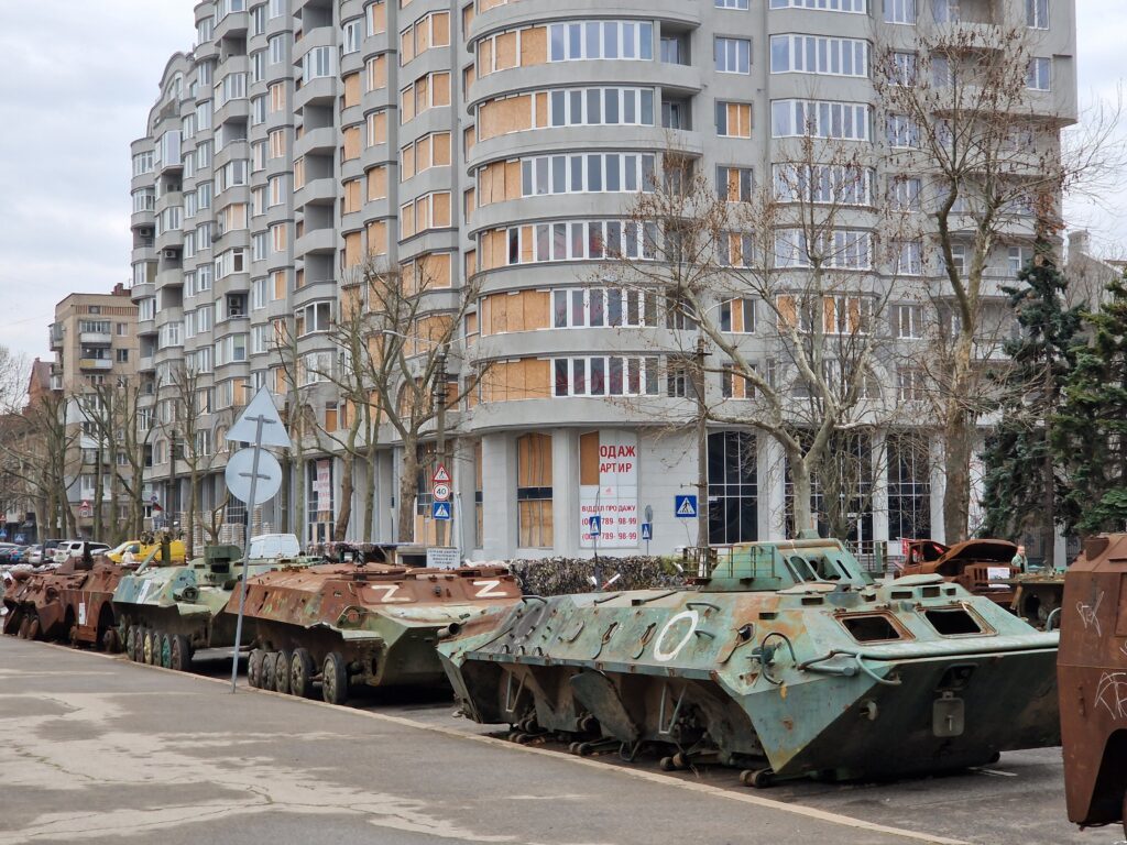 Depuis le 24 février 2022, un triste bilan… Sont à dénombrer des centaines de milliers de morts et de blessés civils et militaires russes et ukrainiens. Il y a des dizaines de millions de déplacés ukrainiens. Ce sont aussi des villes et des villages ravagés, des maisons et des immeubles détruits ou éventrés, des cratères d’obus et des carcasses de blindés ici, des barbelés et des check-points là, des abris anti-bombes à la place des abribus, des sacs de sable entassés dans des endroits sensibles…